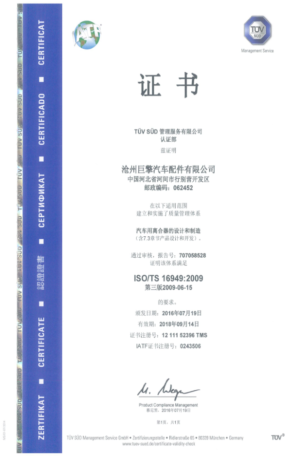 經(jīng)過公司上下多年的努力,正式取得了由德國南德TüV公司頒發(fā)的ISO/TS 16949:2009證書,自此,為主機廠配套和邁向國際市場將拉開帷幕,滄州巨擎汽車配件有限公司將掀開新的篇章。